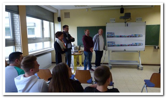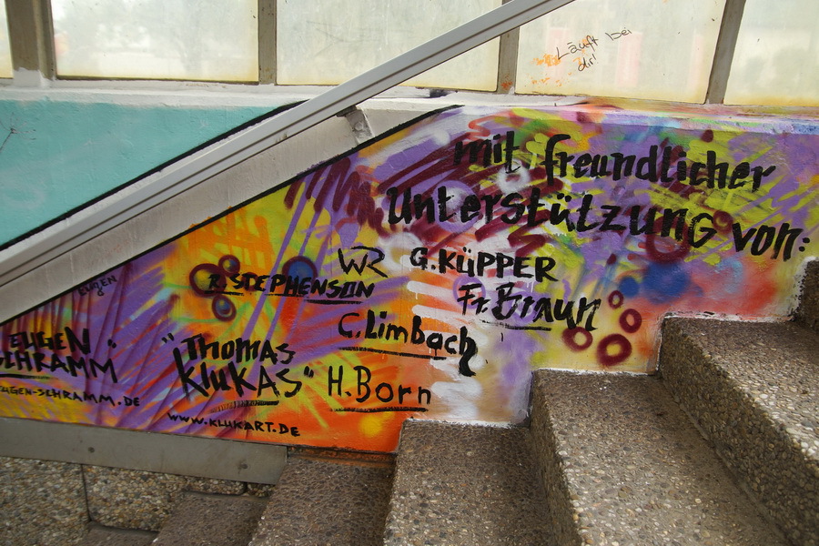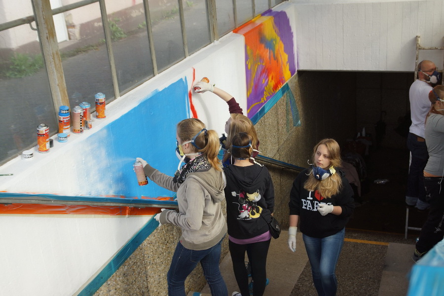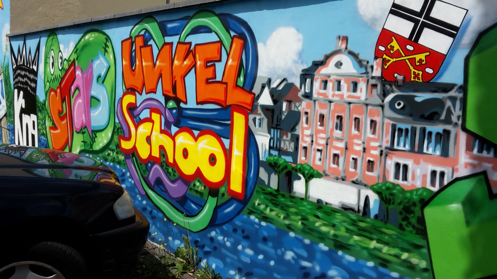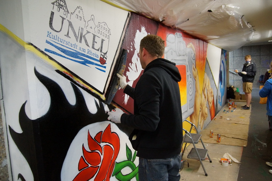 Ein künstlerisches Projekt der außergewöhnlichen Art verwirklichten Neunt- und Zehntklässler im Juli 2014 am Bahnhof Unkel. Auf Initiative von Dr. Helmut Born erklärten die beiden Graffiti-Künstler Thomas Kuklas (Köln) und Eugen Schramm (Bonn) ihre Bereitschaft das Projekt künstlerisch zu begleiten. Die gut 20 Schülerinnen und Schüler entwarfen im Vorfeld eigene Motive, unterstützt wurden sie dabei durch die Kunstlehrerinnen Renata Westhoven und Carola Limbach. Bei der Gesamtgestaltung sowie der technischen Umsetzung überzeugten Kuklas und Schramm dann auf der ganzen Linie. Mit Atemschutzmasken ausgerüstet sprayten die Schüler farbenfroh und hoch engagiert ihre Entwürfe auf die zuvor gereinigten Wände der Bahnunterführung. Organisatorische Hilfe leisteten Rex Stephenson, Birgit Braun und Gudrun Küpper. Entscheidender Dank gebührt aber vor allem dem Ideengeber Helmut Born, der in aller Bescheidenheit das Projekt sowohl finanziell als auch tatkräftig und vor Ort unterstützt hat.