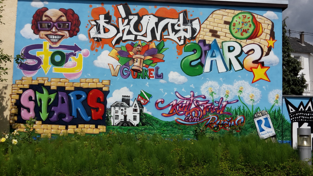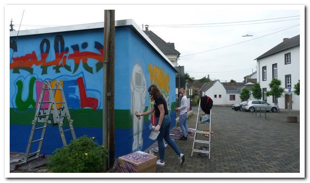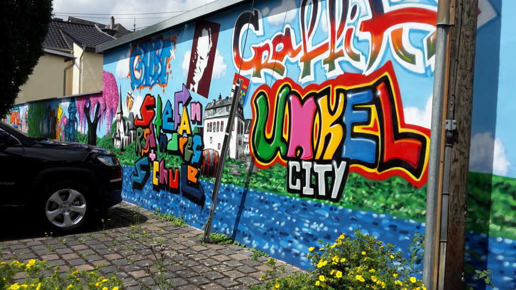 Unkel. Die Wand auf dem Parkplatz der Unkeler Verbandsgemeindeverwaltung ist jetzt ein echter Hingucker. SChüler der Stefan-Andres-Realschule plus in Unkel haben die ehemals triste Wand mit Graffiti gestaltet. Angeleidet wurden sie bei dem Projekt von den Graffitikünstlern Eugen Schramm und Thomas Kuklas, die vor Jahren schon mit Schülern die Unterführung des Bahnhofs gestaltet haben. Das aktuelle Projekt wird durch das Leader-Programm gefördert. Die Nachbarn der Verwaltung, die Eheleute Ines Unger und Georg Weber, haben die Kosten für das Herrichten des Wanduntergrundes getragen. " Wir haben so wenig Vorgaben wie möglich gemacht. Nur ein gewisser Bezug zu Unkel sollte bestehen.", so Bürgermeister Karsten Fehr.