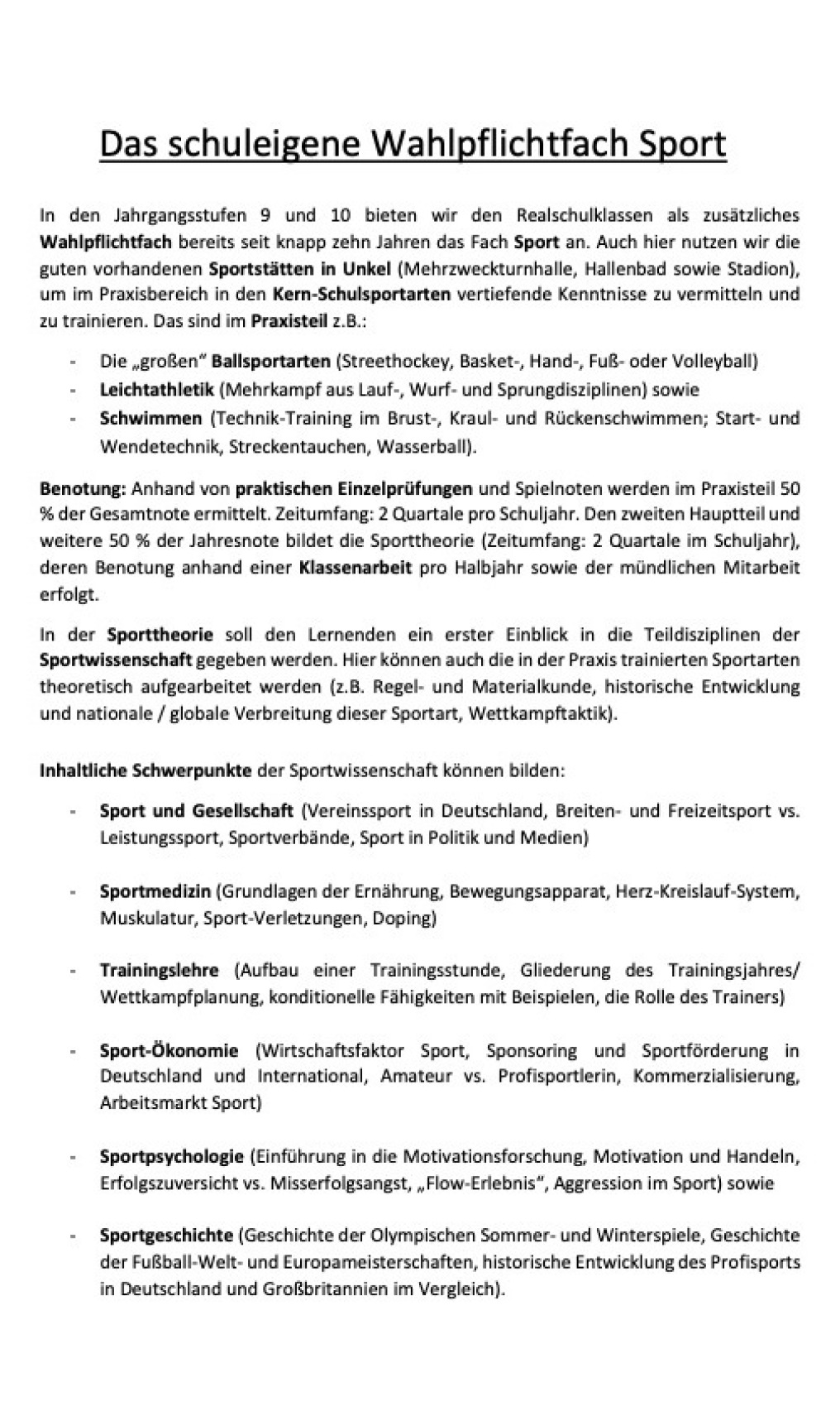 Ab Stufe 9 teilt sich das WPF in die bisherigen Fächer ein und außerdem kommen die Fächer Mathematik-Naturwissenschaft und Sport hinzu. Beide Bereiche werden jeweils zwei Stunden in der Woche unterrichtet.